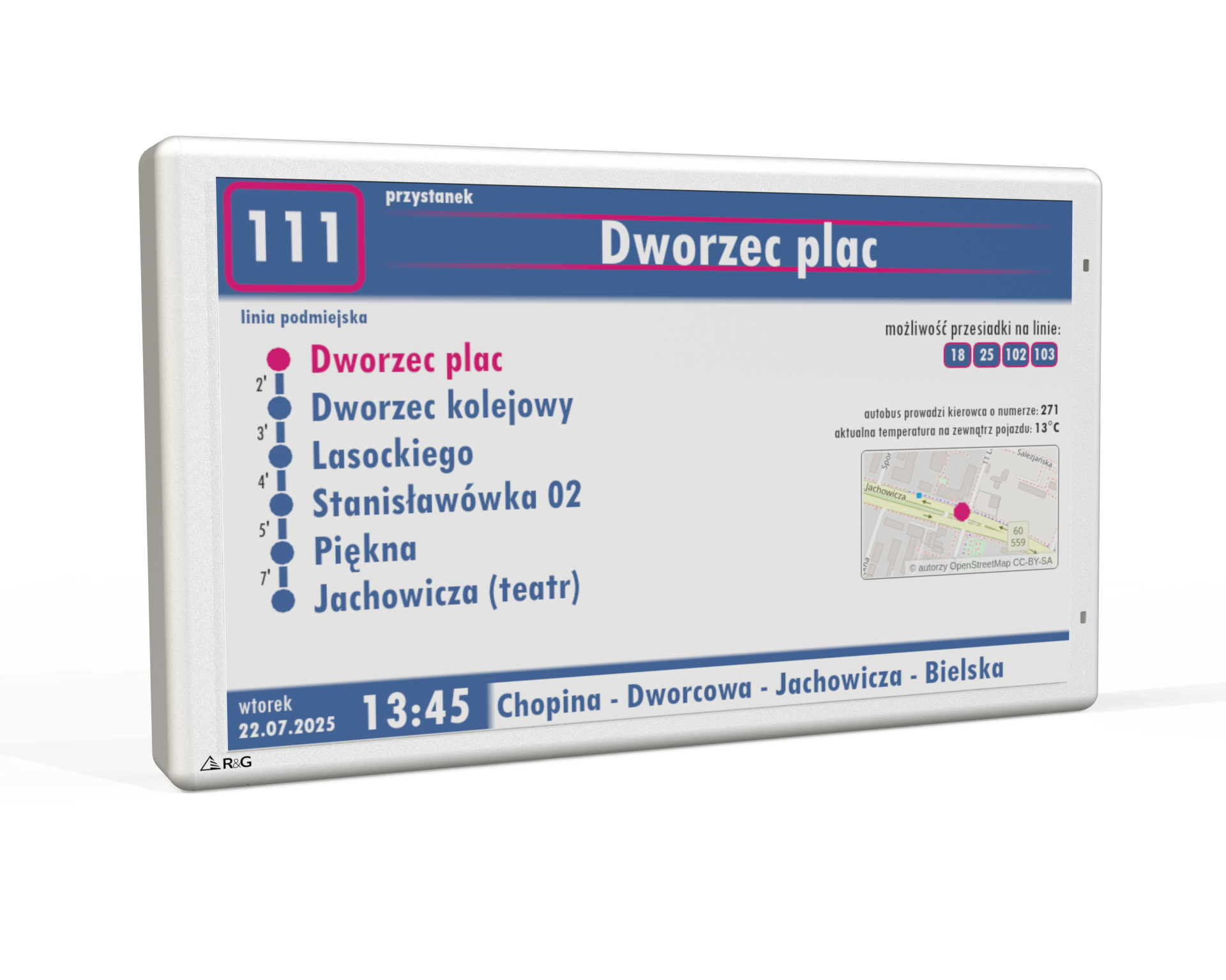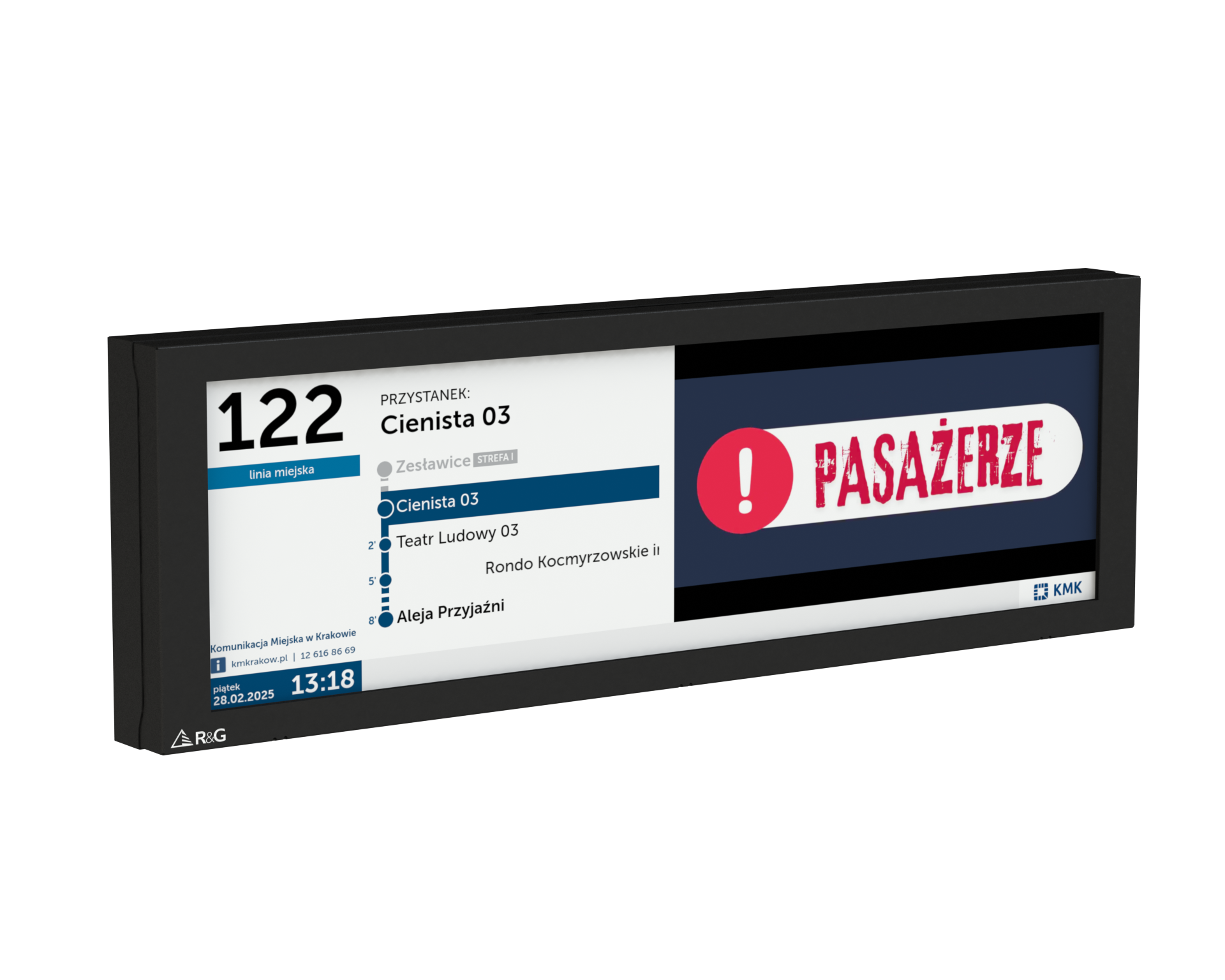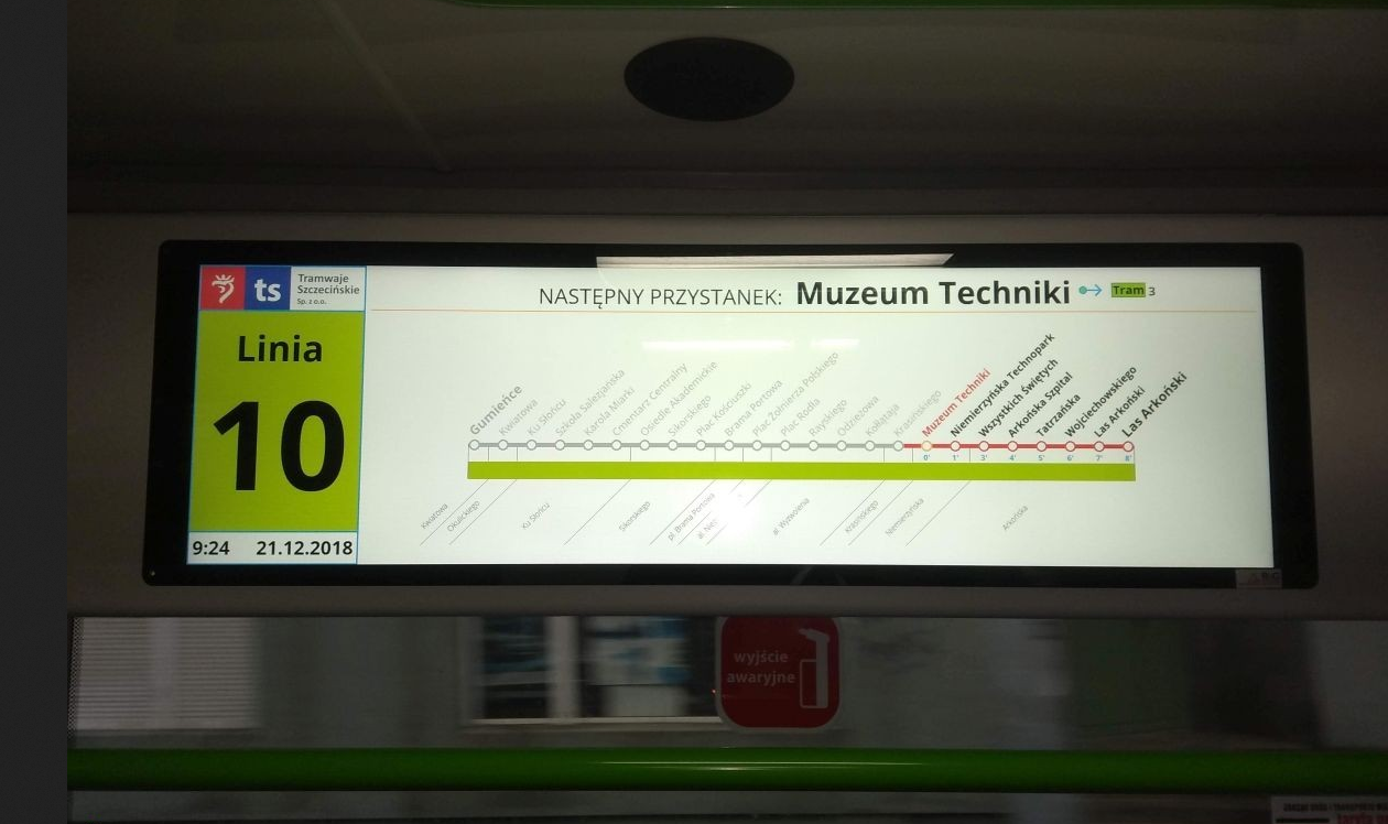 Tablica LCD przeznaczona jest do montażu wewnątrz pojazdów komunikacji publicznej i pełni funkcję informacyjne oraz reklamowe. Urządzenie składa się z wysokiej jakości matrycy LCD oraz zintegrowanego komputera, który odpowiada za przetwarzanie i prezentację treści.