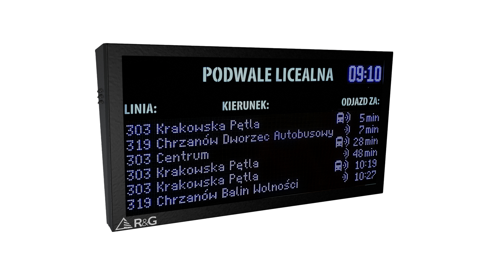 Tablice TIP to zewnętrzne urządzenia informacji pasażerskiej, montowane w pobliżu przystanków, dworców oraz węzłów przesiadkowych. W zależności od lokalizacji i potrzeb, możliwy jest montaż tablicy na słupie, na elewacji budynku lub w formie podwieszenia – np. pod zadaszeniem przystanku. Tablice mogą być jednostronne lub dwustronne, a ich rozmiary dostosowywane są do konkretnego projektu i miejsca instalacji.